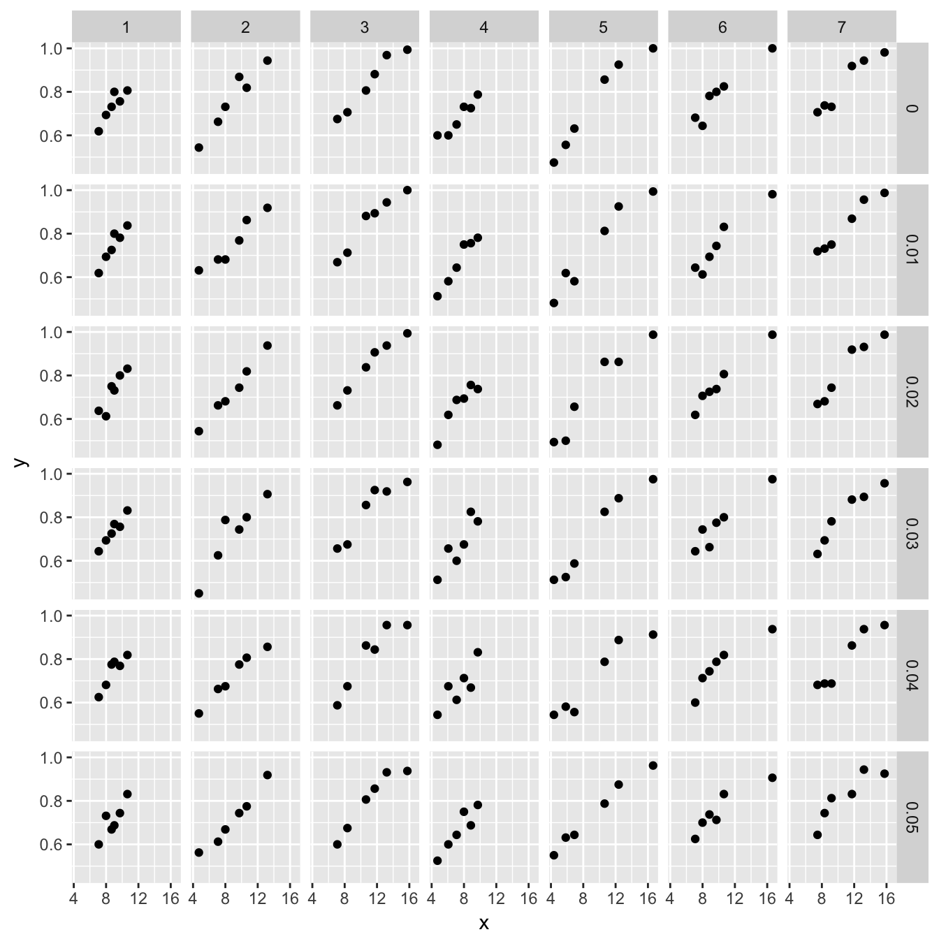 facet_grid(lambda ~ squeme) + geom_point(aes(x = x, y = y))