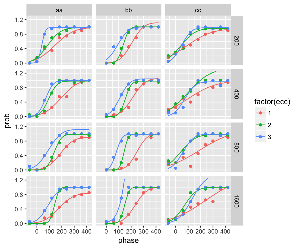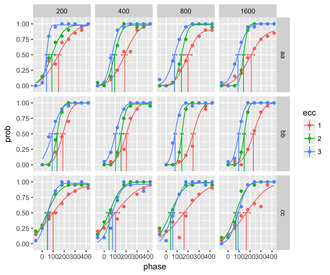 fitWithLapses <- quickpsy(qpdat, phase, resp, grouping = c(ecc, interval ,participant), lapses = T, bootstrap = 'none')