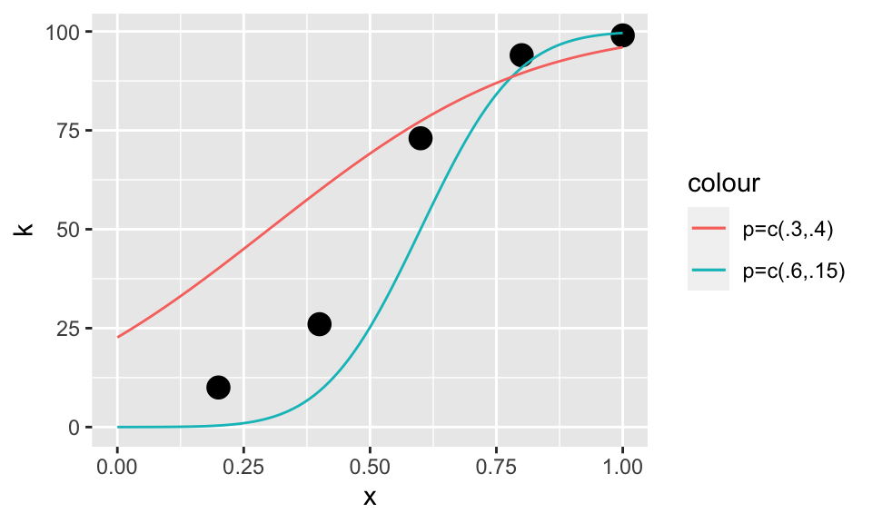 geom_line(data=curve2,aes(x=xSeq,y=kPred2,color='p=c(.3,.4)'))
