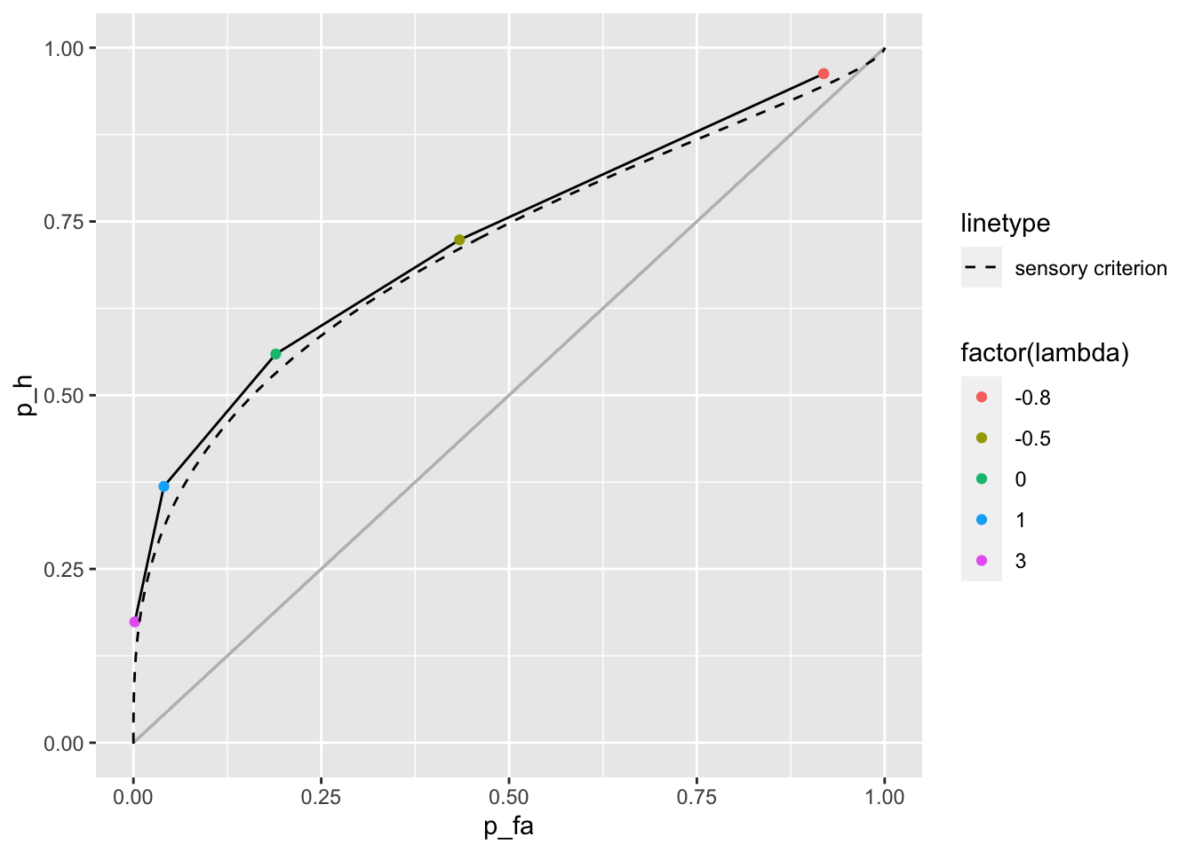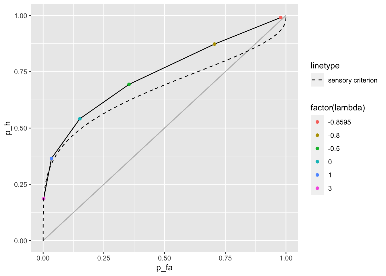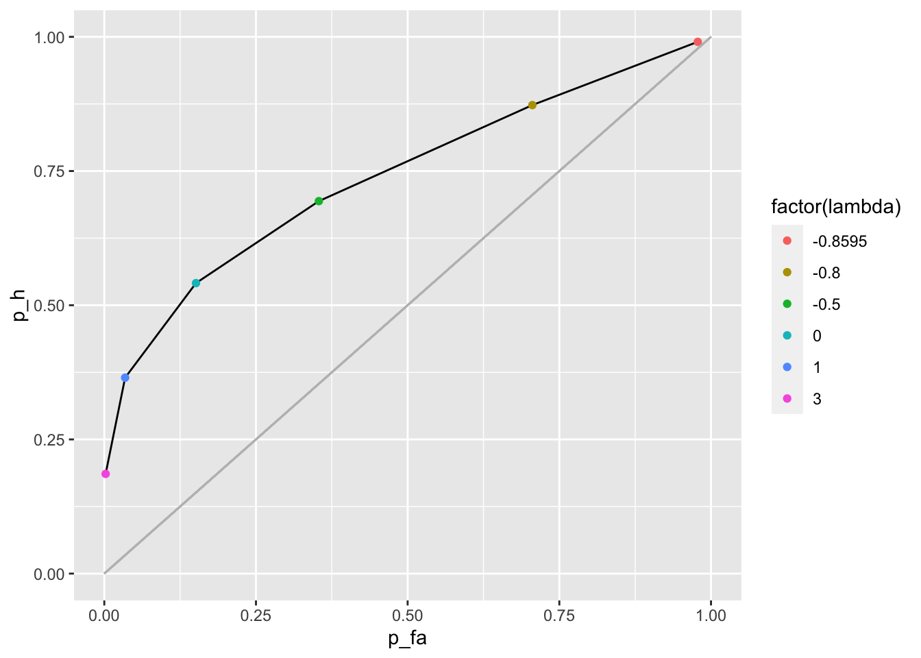 geom_point(aes(x = p_fa, y = p_h, color = factor(lambda))) +